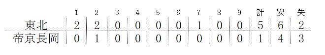 この試合、東北は6安打しか打ってないのに5点取ってるのが面白いよね。一気に打ち崩した感じじゃないのが特徴的。